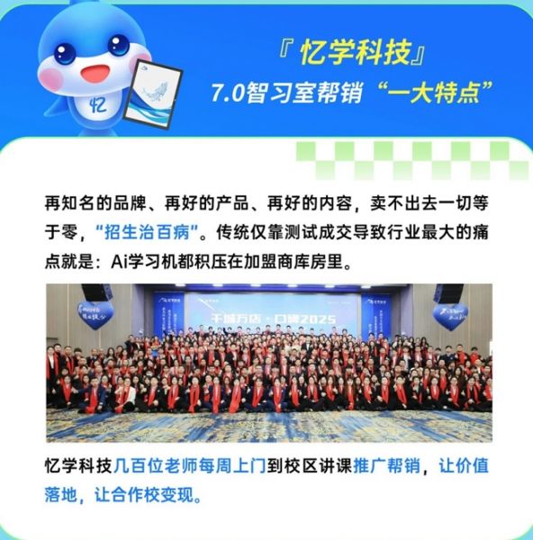 忆学科技推出的"全人成长AI智习室7.0"为行业带来破局方案。区别于传统智习室只有学科培训的模式,该方案首创"记忆+全科+研学"评估体系,涵盖记忆方法、学科素养、素质研学,“三维一体”成长维度,为学员提供个性化整体成长解决方案。幼儿园仅需腾出1间教室,总部即派驻专业老师上门讲课推广帮销,通过"帮销模式"实现变现创收。